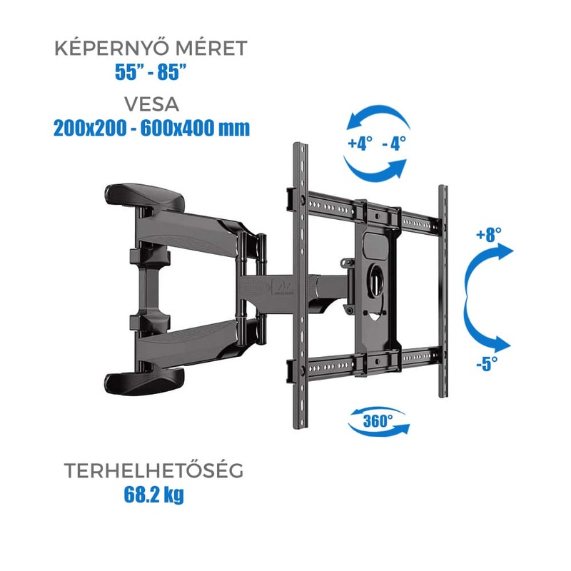Ez a konzol lehetővé teszi a képernyő döntését (-5° és +3° között), forgatását (-90° és +90° között), valamint akár 500 mm-re elhúzható a faltól.